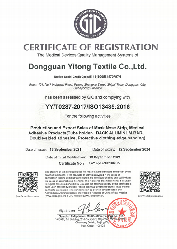 Founded in 2003, Yitong Textile Co. is a dedicated manufacturer of medical adhesive tape, hook and loop fasteners, and cable wire ties. We specialize in customization services to meet the individual demands of customers for their various applications, such as medical and industrial applications. To date, we have produced custom products including tube holder tape, nose bridge wire for mouth masks, hook and loop closures for surgical gowns and baby diapers, medical bandages, and protection bands.